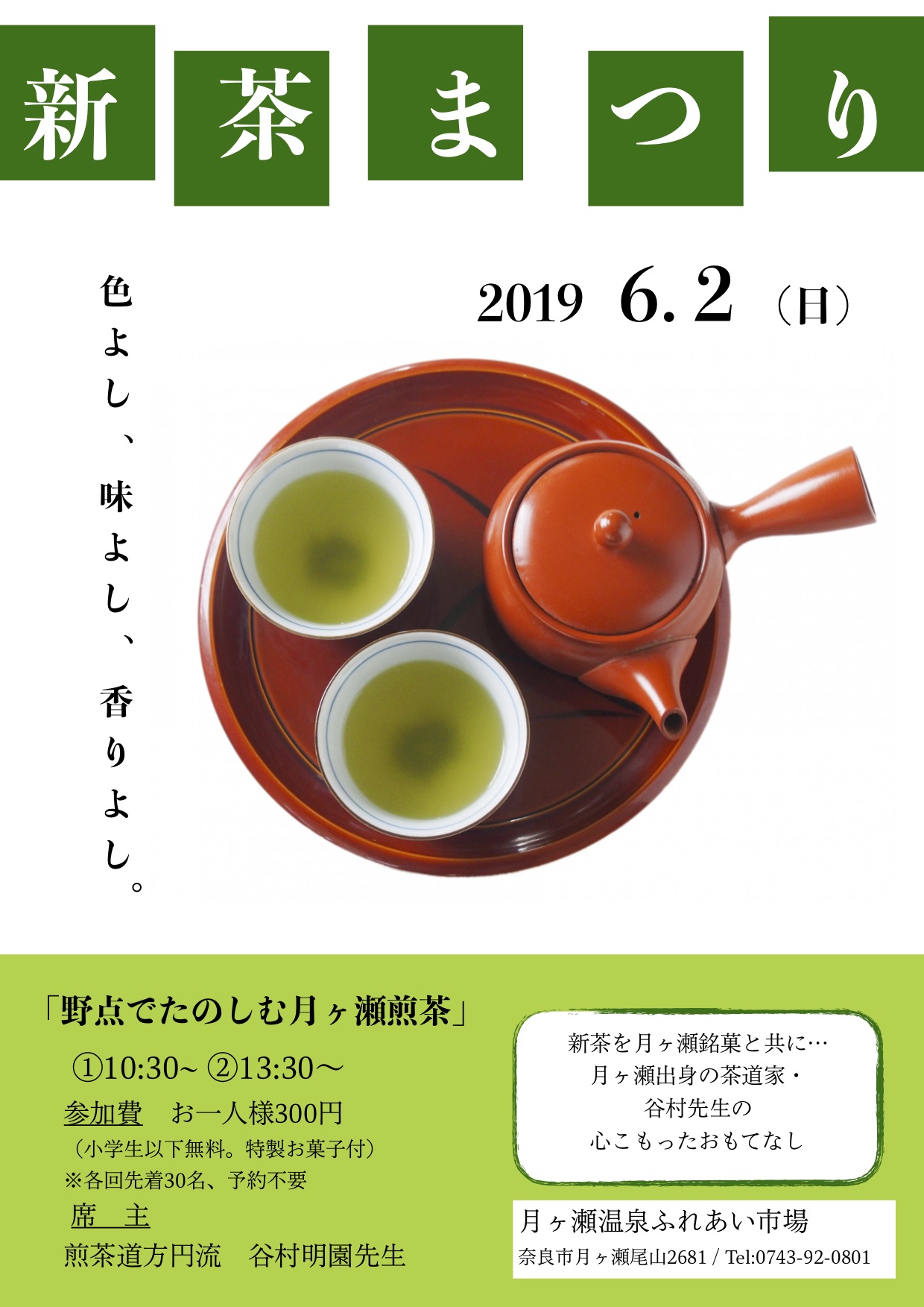 新茶まつり・野点で楽しむ月ヶ瀬煎茶|2019年6月2日(日)月ヶ瀬温泉ふれあい市場 2019.5.22 ツイート シェア 色よし、味よし、香りよし。 月ヶ瀬の新茶を月ヶ瀬銘菓と共にたのみしましょう。 月ヶ瀬出身の茶道家・谷村明園先生の、心こもったおもてなしの会です。 どなたでもお気軽にご参加ください。 —– 「野点で楽しむ月ヶ瀬煎茶」 ①10:30〜 ②13:30〜 参加費:お一人様300円(小学生以下無料。特製お菓子付。) 席主:煎茶道方円流 谷村明園先生 ※各回先着30名、予約不要 主催・お問い合わせ 月ヶ瀬温泉ふれあい市場 奈良市月ヶ瀬尾山2681 Tel:0743-92-0801